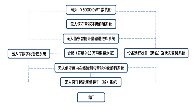由無人值守智能環(huán)保卸船系統(tǒng)、無人值守智能計(jì)量輸送進(jìn)庫系統(tǒng)、無人值守庫內(nèi)在線監(jiān)測(cè)與智能均化卸料系統(tǒng)、無人值守智能定量裝車(船)系統(tǒng)、出入庫數(shù)字化管控系統(tǒng)、設(shè)備遠(yuǎn)程操作(運(yùn)維)及狀態(tài)監(jiān)管系統(tǒng)等六大分系統(tǒng)構(gòu)成。充分體現(xiàn)了環(huán)保型、無人化、智能化、信息化等。