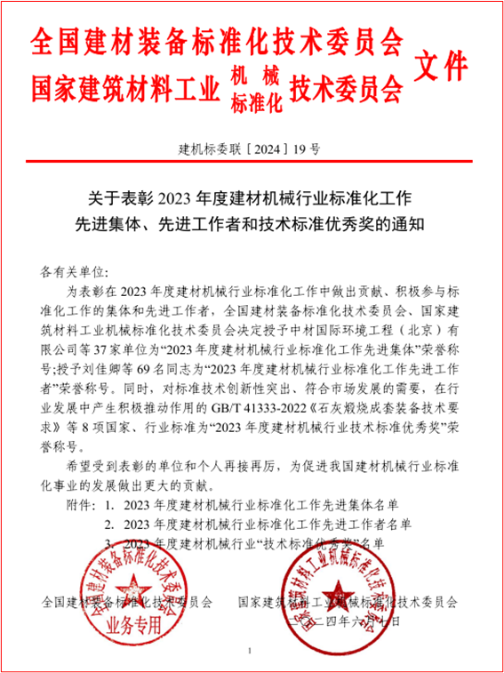 會上,為表彰在2023年度建材機械行業標準化工作中做出貢獻、積極參與標準化工作的集體和先進工作者,全國建材裝備標準化技術委員會、國家建筑材料工業機械標準化技術委員會決定授予中材國際環境工程(北京)有限公司等37家單位為“2023年度建材機械行業標準化工作先進集體”榮譽稱號;授予劉佳卿等69名同志為“2023年度建材機械行業標準化工作先進工作者”榮譽稱號。同時,對標準技術創新性突出、符合市場發展的需要,在行業發展中產生積極推動作用的GB/T 41333-2022《石灰煅燒成套裝備技術要求》等8項國家、行業標準為“2023年度建材機械行業技術標準優秀獎”榮譽稱號。