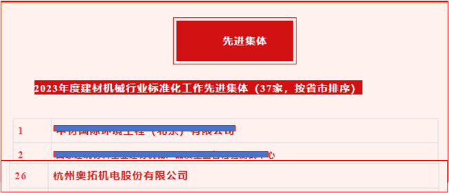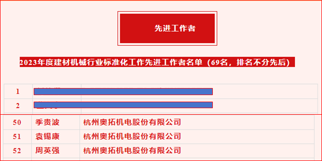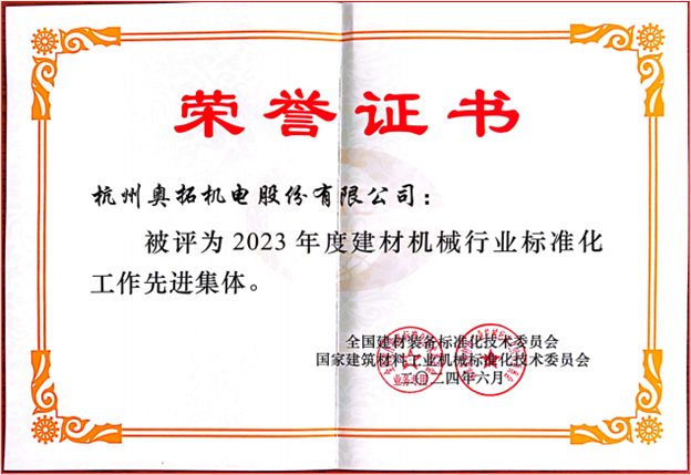 自2018年以來,奧拓股份已連續獲得“建材機械行業標準化工作先進集體”表彰,相關工作人員也連續獲得“建材機械行業標準化工作先進工作者”表彰,主導的二項行業標準均獲得“建材機械行業技術標準優秀獎”表彰。