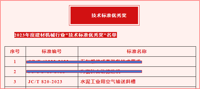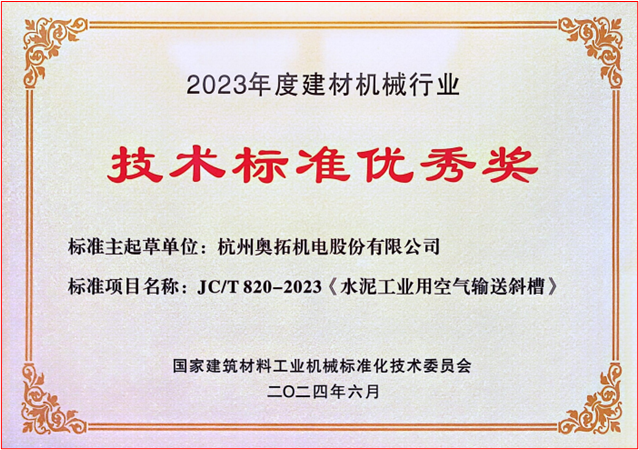奧拓股份主導的JC/T 820-2023《水泥工業用空氣輸送斜槽》獲得“2023年度建材機械行業技術標準優秀獎”表彰。