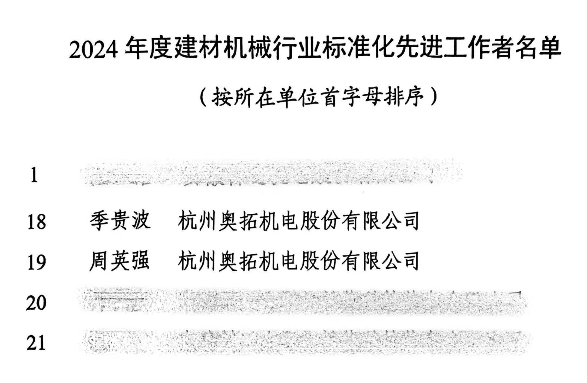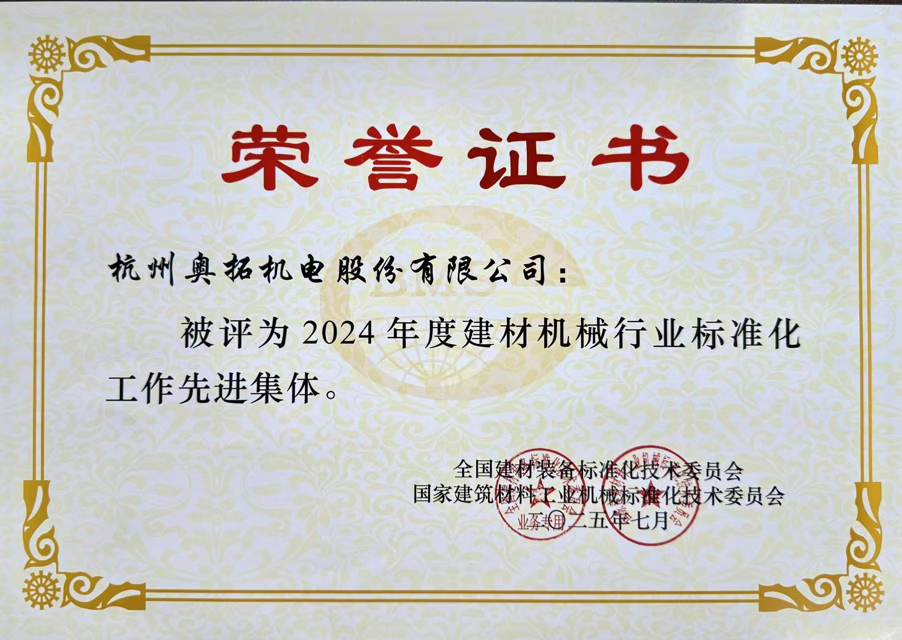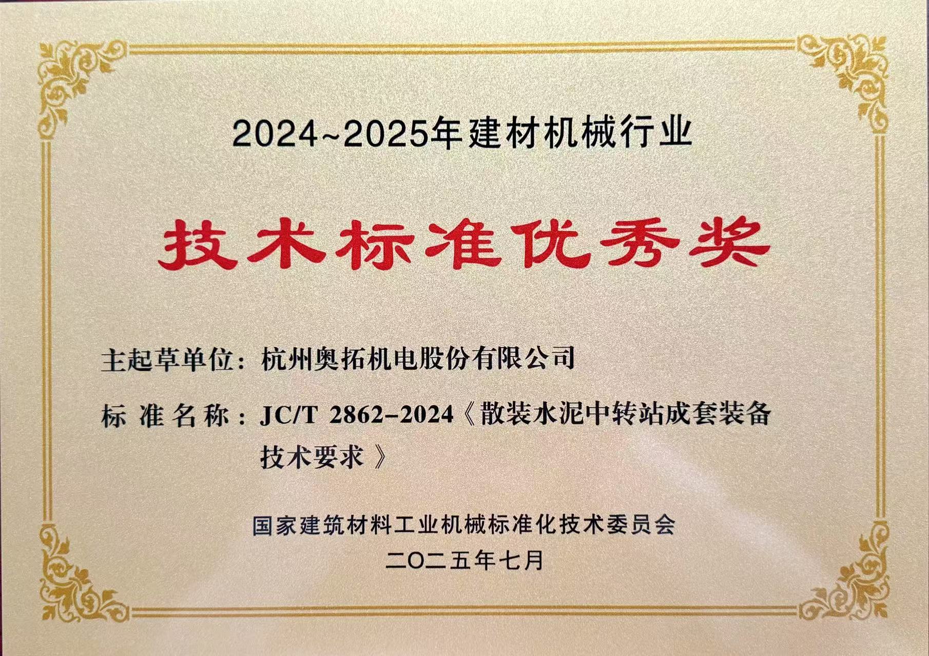 會議期間,為表彰在2024年度建材機(jī)械行業(yè)標(biāo)準(zhǔn)化工作中做出貢獻(xiàn)、積極參與標(biāo)準(zhǔn)化工作的集體和先進(jìn)工作者,授予杭州奧拓機(jī)電股份有限公司等24家單位為“2024年度建材機(jī)械行業(yè)標(biāo)準(zhǔn)化工作先進(jìn)集體”榮譽(yù)稱號。