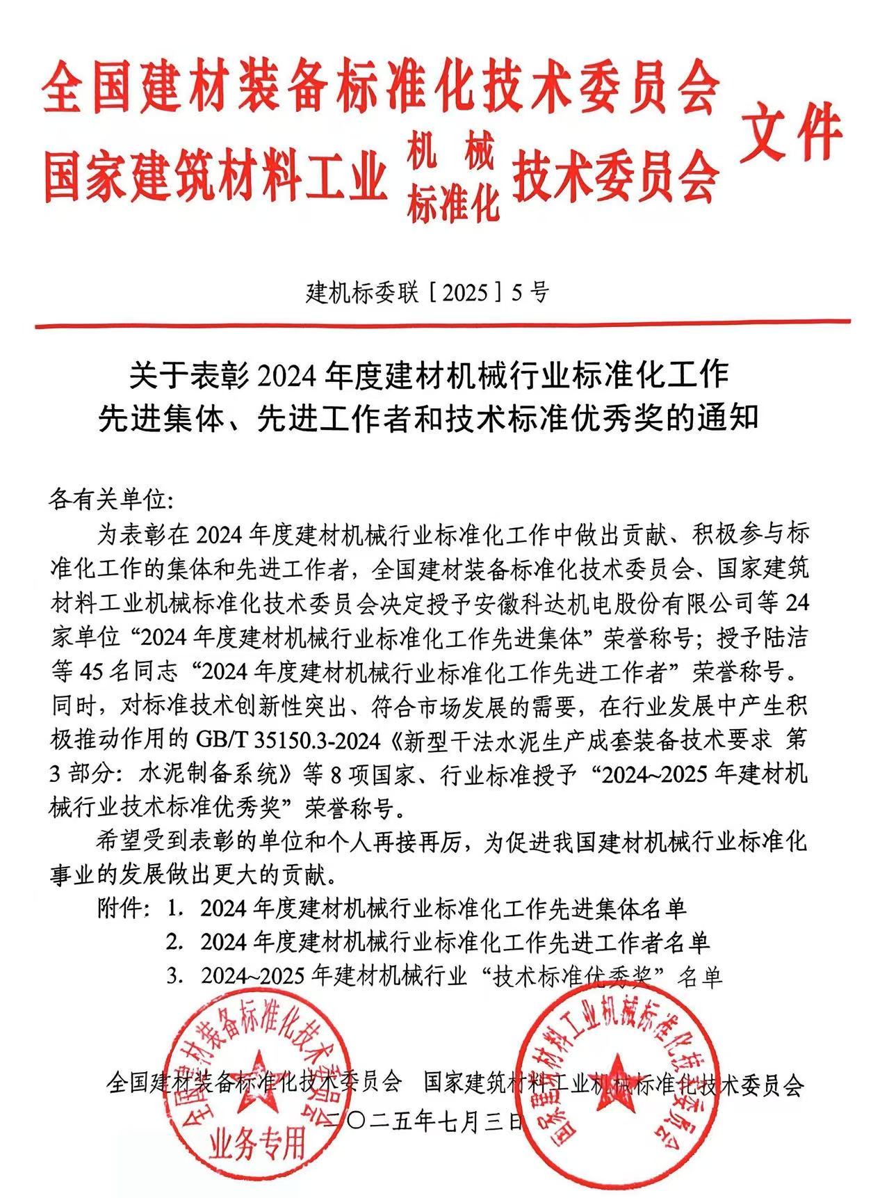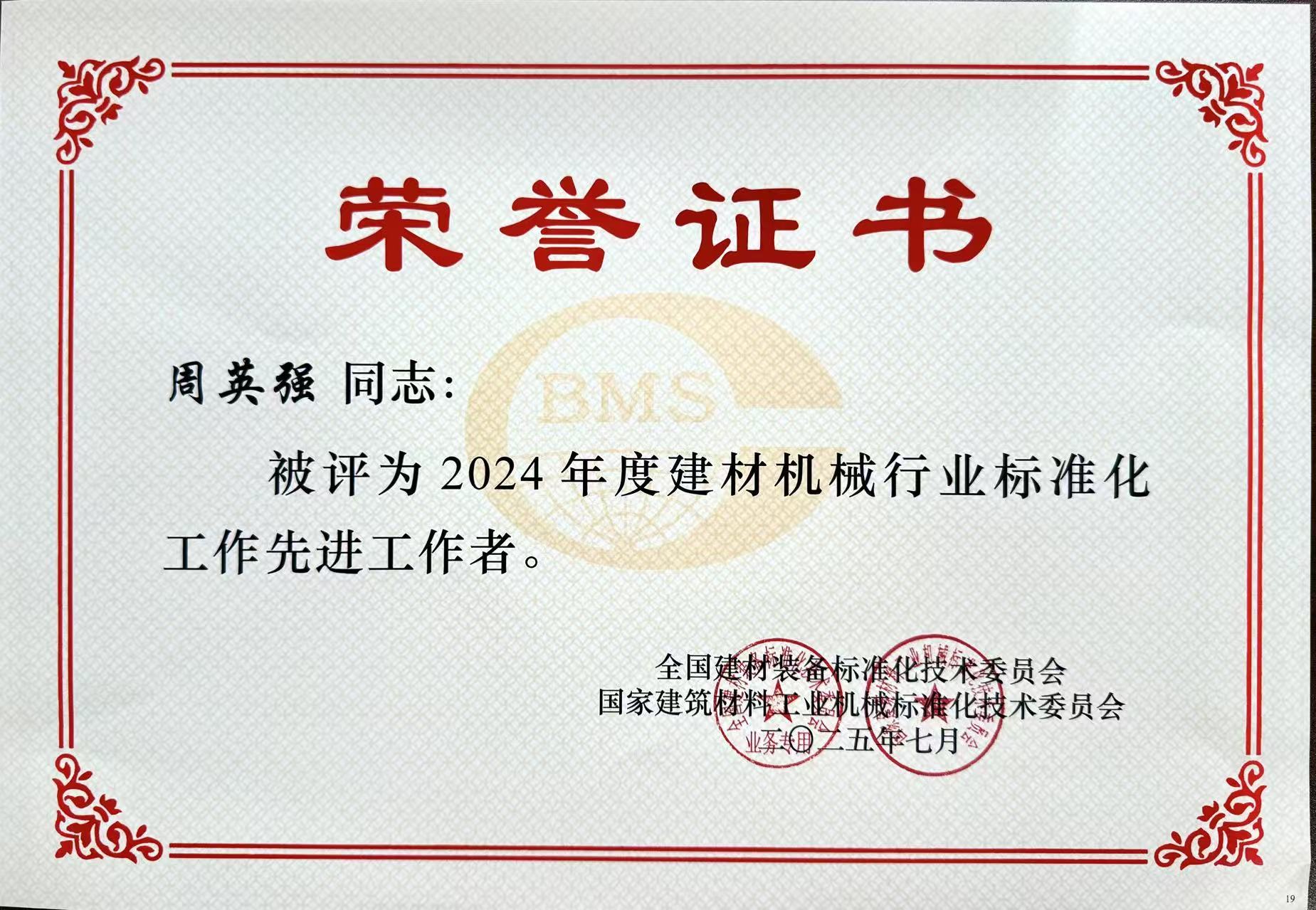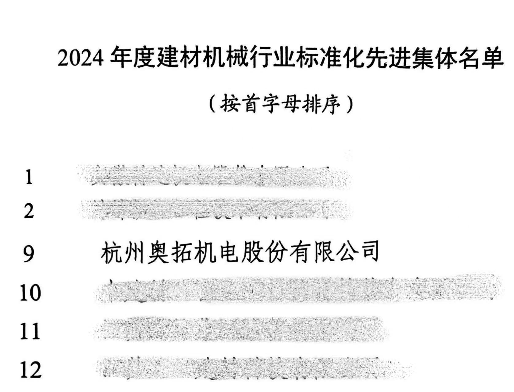 會議期間,為表彰在2024年度建材機(jī)械行業(yè)標(biāo)準(zhǔn)化工作中做出貢獻(xiàn)、積極參與標(biāo)準(zhǔn)化工作的集體和先進(jìn)工作者,授予杭州奧拓機(jī)電股份有限公司等24家單位為“2024年度建材機(jī)械行業(yè)標(biāo)準(zhǔn)化工作先進(jìn)集體”榮譽(yù)稱號。