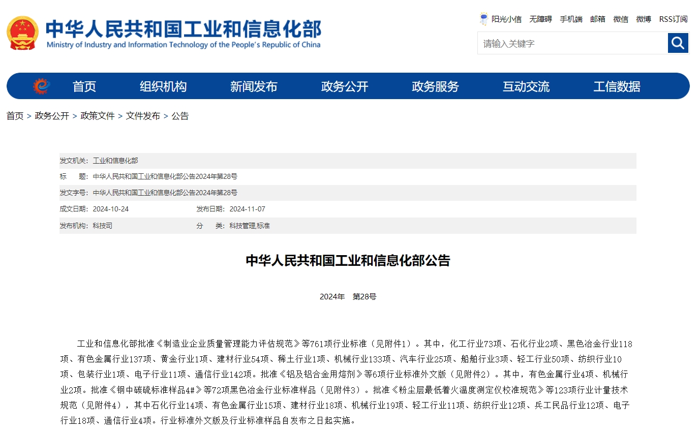 近日,工業和信息化部發布了2024年 第28號 公告,批準《制造業企業質量管理能力評估規范》等761項行業標準(其中建材行業標準54項)。由杭州奧拓機電股份有限公司主導,中建材(合肥)機電工程技術有限...